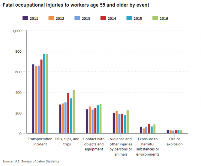 Falls, slips, and trips resulted in 426 fatal injuries to workers age 55 and older in 2016, second only behind transportation incidents. Within this category, 313 workers died from falls to a lower level. These include falls due to collapsing structures or equipment, through a surface or existing opening, or from objects or structures (such as trees, stairs, or roofs).