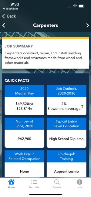 The CareerInfo app helps you find information about employment, pay, job outlook, education and training requirements, and more for hundreds of detailed occupations. You can browse occupational groups and titles or search by occupation or keywords. Within occupational groups, the app allows you to sort by occupation title, projected growth, and typical education or median pay. You also now can browse top lists such as top paying, fastest growing, and most new jobs! Each occupational profile now includes more detailed information on what they do, work environment, how to become one, pay, and job outlook.