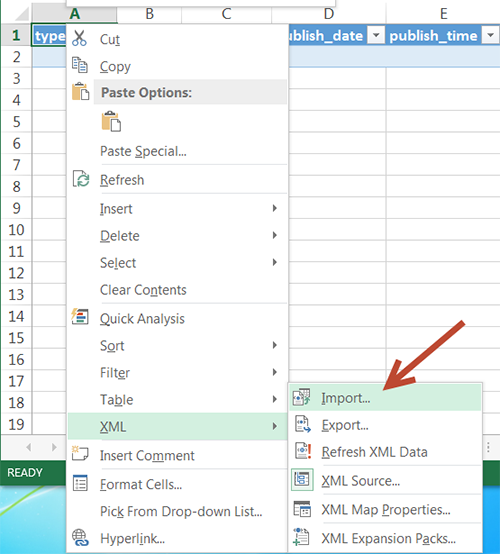 - Once cells in the Excel are mapped to source, right click on a cell column title, select XML > Import, and browse to the OOH Compilation saved file to be imported.