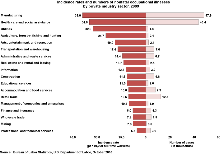 Manufacturing and Health care & social assistance together reported the majority of private industry illnesses in 2009, resulting in an illness rate in Manufacturing that was more than twice the rate of illnesses nationally (18.3 cases per 10,000 full-time workers).