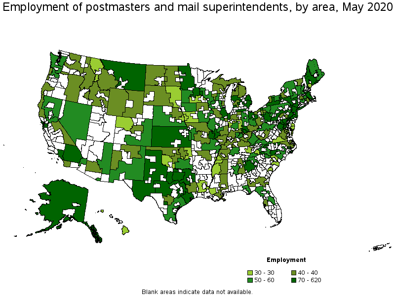 States and areas with the highest published employment, location quotients, and wages for Postmasters and Mail Superintendents are provided. For a list of all areas with employment in Postmasters and Mail Superintendents, see the Create Customized Tables function.