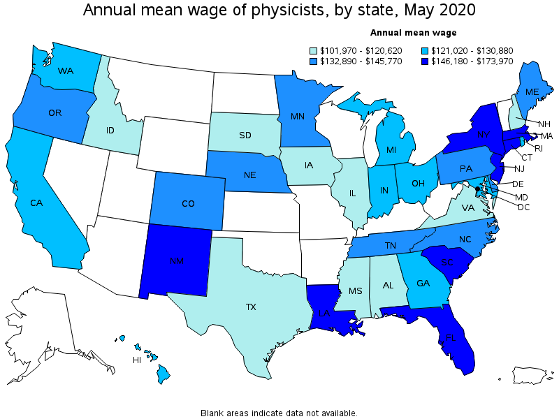 States and areas with the highest published employment, location quotients, and wages for Physicists are provided. For a list of all areas with employment in Physicists, see the Create Customized Tables function.