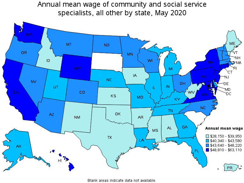 States and areas with the highest published employment, location quotients, and wages for Community and Social Service Specialists, All Other are provided. For a list of all areas with employment in Community and Social Service Specialists, All Other, see the Create Customized Tables function.