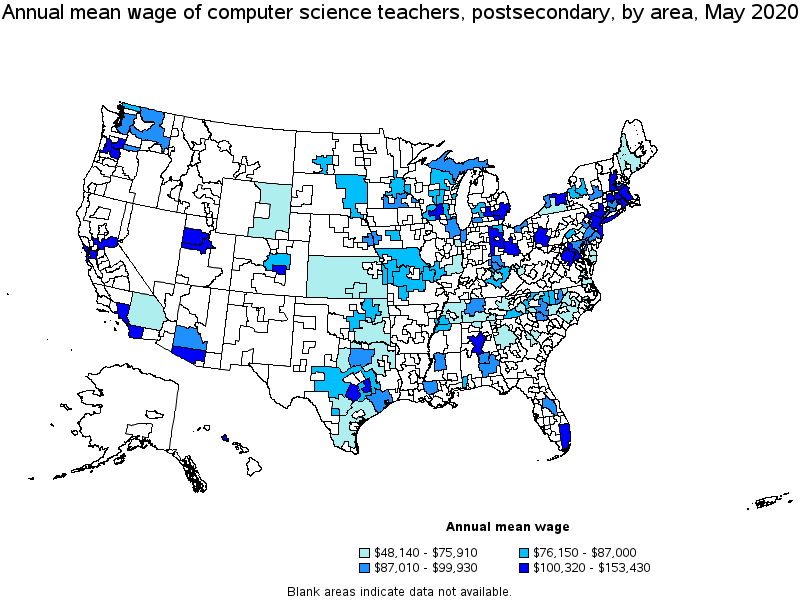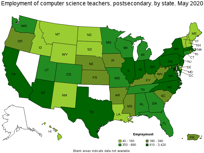 States and areas with the highest published employment, location quotients, and wages for Computer Science Teachers, Postsecondary are provided. For a list of all areas with employment in Computer Science Teachers, Postsecondary, see the Create Customized Tables function.