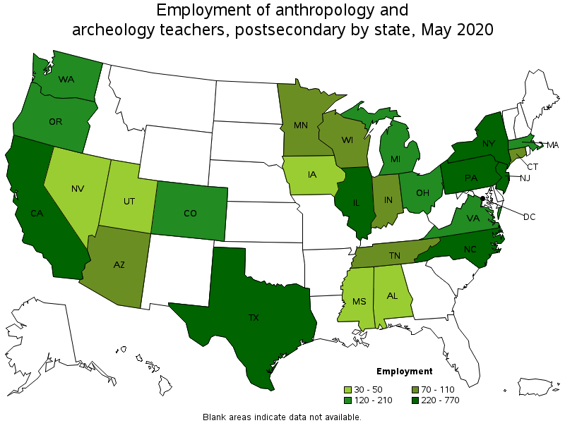 States and areas with the highest published employment, location quotients, and wages for Anthropology and Archeology Teachers, Postsecondary are provided. For a list of all areas with employment in Anthropology and Archeology Teachers, Postsecondary, see the Create Customized Tables function.
