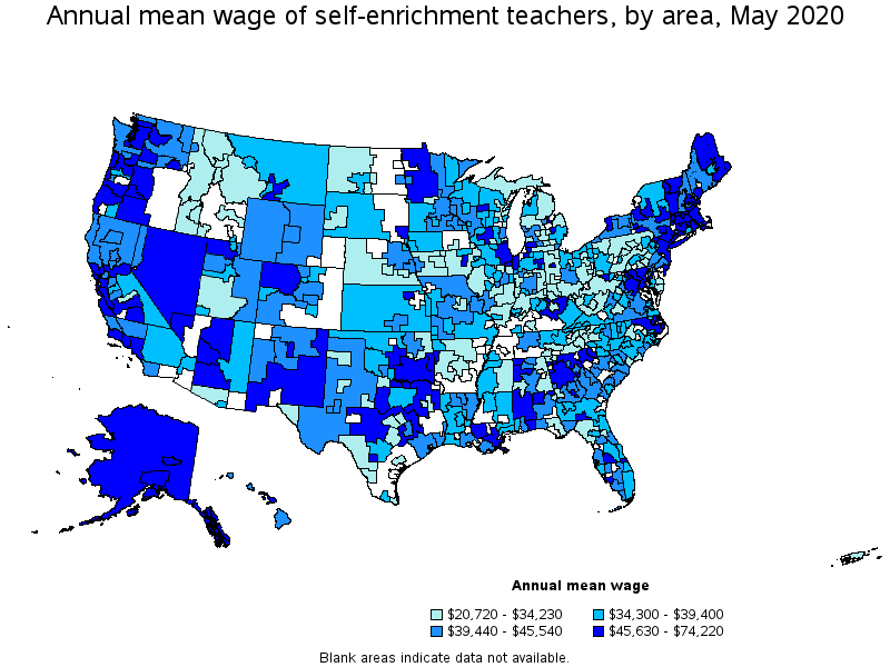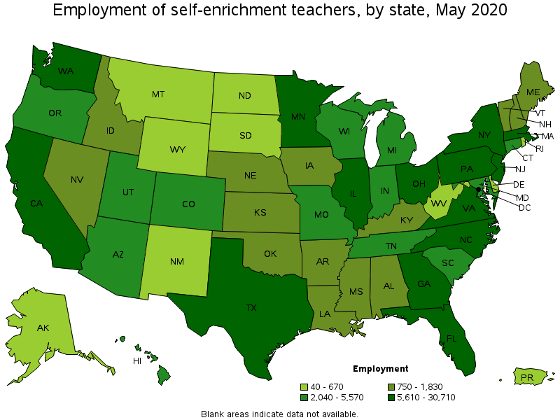 States and areas with the highest published employment, location quotients, and wages for Self-Enrichment Teachers are provided. For a list of all areas with employment in Self-Enrichment Teachers, see the Create Customized Tables function.