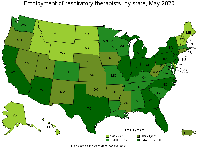 States and areas with the highest published employment, location quotients, and wages for Respiratory Therapists are provided. For a list of all areas with employment in Respiratory Therapists, see the Create Customized Tables function.
