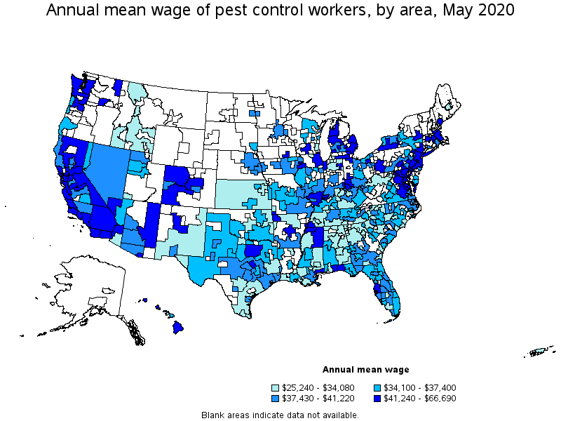 States and areas with the highest published employment, location quotients, and wages for Pest Control Workers are provided. For a list of all areas with employment in Pest Control Workers, see the Create Customized Tables function.