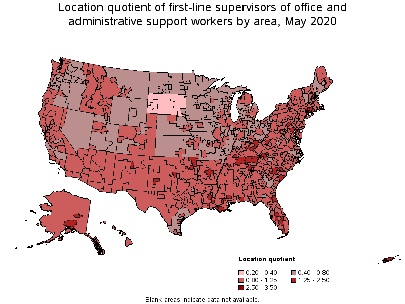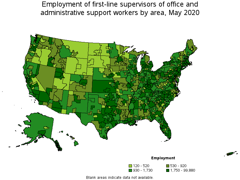 States and areas with the highest published employment, location quotients, and wages for First-Line Supervisors of Office and Administrative Support Workers are provided. For a list of all areas with employment in First-Line Supervisors of Office and Administrative Support Workers, see the Create Customized Tables function.