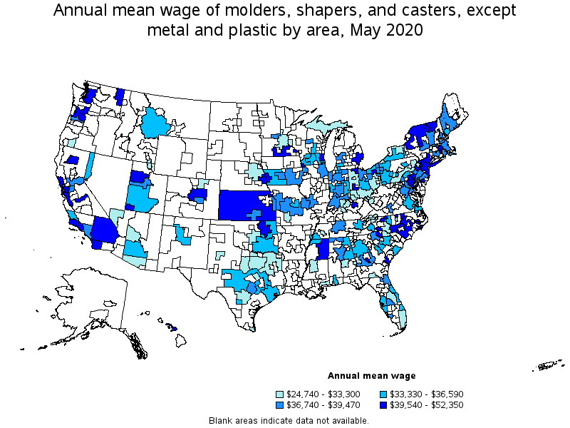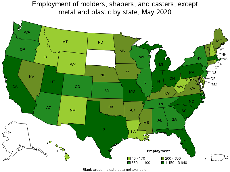 States and areas with the highest published employment, location quotients, and wages for Molders, Shapers, and Casters, Except Metal and Plastic are provided. For a list of all areas with employment in Molders, Shapers, and Casters, Except Metal and Plastic, see the Create Customized Tables function.