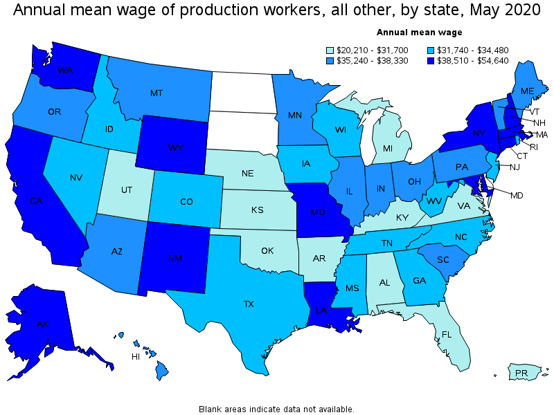 States and areas with the highest published employment, location quotients, and wages for Production Workers, All Other are provided. For a list of all areas with employment in Production Workers, All Other, see the Create Customized Tables function.