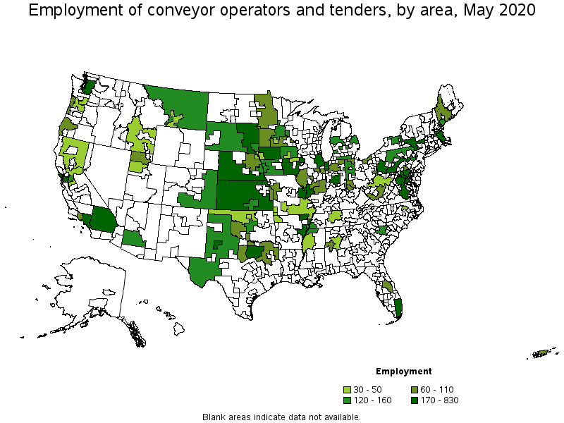 States and areas with the highest published employment, location quotients, and wages for Conveyor Operators and Tenders are provided. For a list of all areas with employment in Conveyor Operators and Tenders, see the Create Customized Tables function.