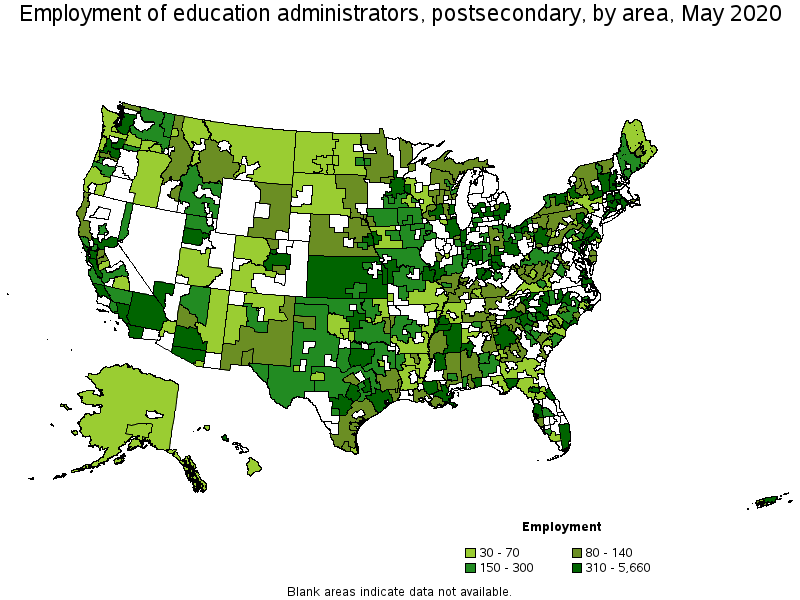 States and areas with the highest published employment, location quotients, and wages for Education Administrators, Postsecondary are provided. For a list of all areas with employment in Education Administrators, Postsecondary, see the Create Customized Tables function.