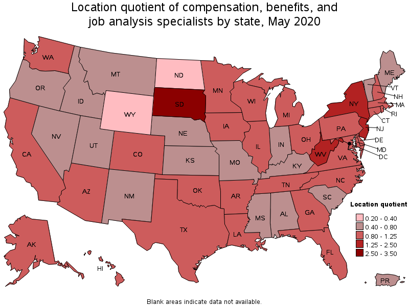 States and areas with the highest published employment, location quotients, and wages for Compensation, Benefits, and Job Analysis Specialists are provided. For a list of all areas with employment in Compensation, Benefits, and Job Analysis Specialists, see the Create Customized Tables function.