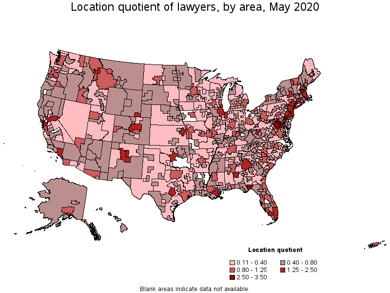Metropolitan areas with the highest concentration of jobs and location quotients in Lawyers: