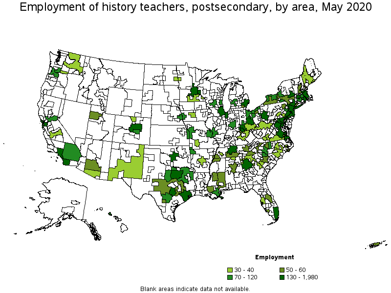 States and areas with the highest published employment, location quotients, and wages for History Teachers, Postsecondary are provided. For a list of all areas with employment in History Teachers, Postsecondary, see the Create Customized Tables function.