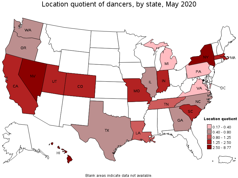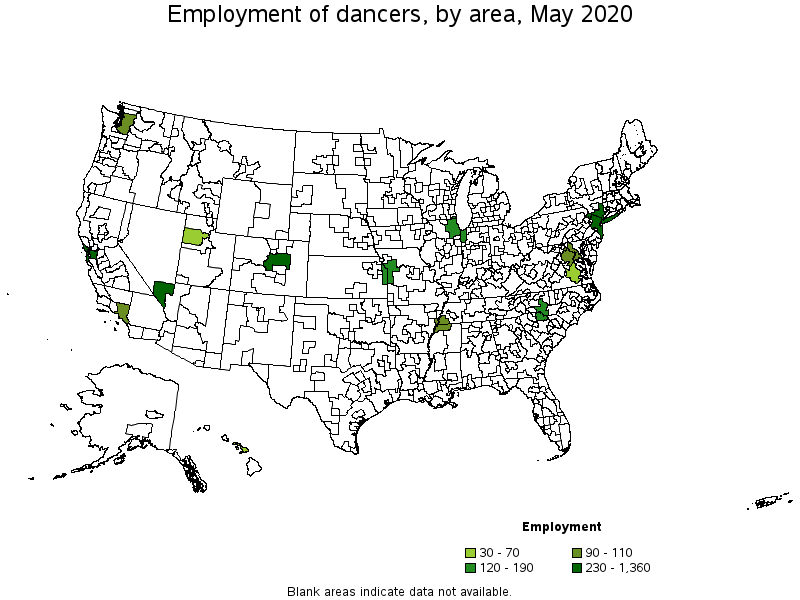 States and areas with the highest published employment, location quotients, and wages for Dancers are provided. For a list of all areas with employment in Dancers, see the Create Customized Tables function.