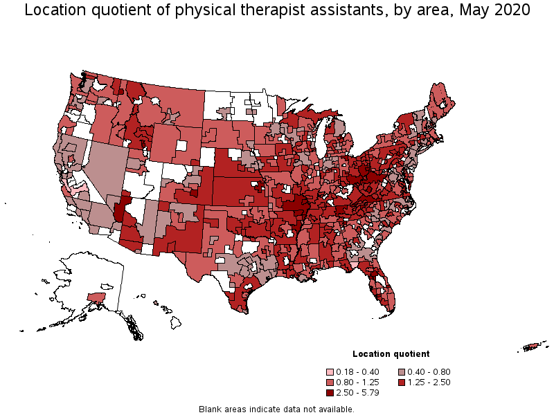 States and areas with the highest published employment, location quotients, and wages for Physical Therapist Assistants are provided. For a list of all areas with employment in Physical Therapist Assistants, see the Create Customized Tables function.