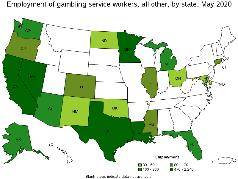 States and areas with the highest published employment, location quotients, and wages for Gambling Service Workers, All Other are provided. For a list of all areas with employment in Gambling Service Workers, All Other, see the Create Customized Tables function.
