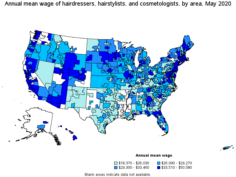 States and areas with the highest published employment, location quotients, and wages for Hairdressers, Hairstylists, and Cosmetologists are provided. For a list of all areas with employment in Hairdressers, Hairstylists, and Cosmetologists, see the Create Customized Tables function.