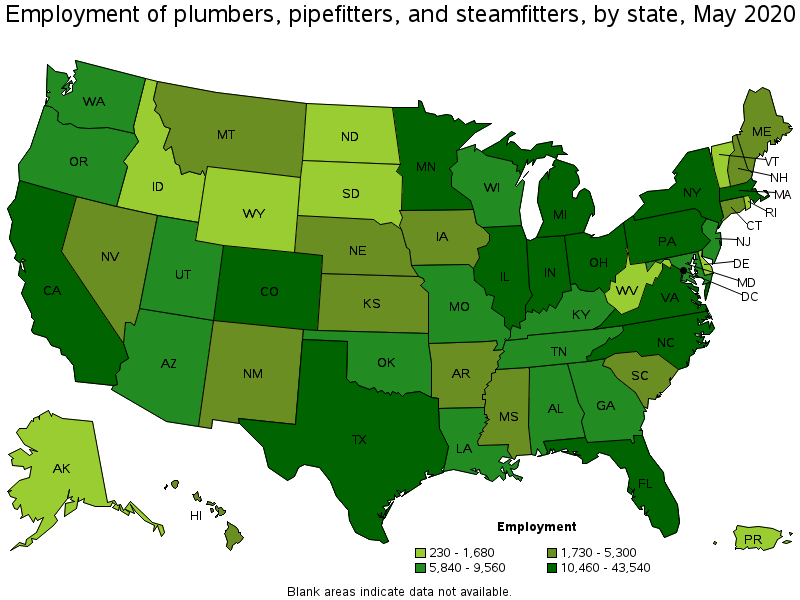 States and areas with the highest published employment, location quotients, and wages for Plumbers, Pipefitters, and Steamfitters are provided. For a list of all areas with employment in Plumbers, Pipefitters, and Steamfitters, see the Create Customized Tables function.