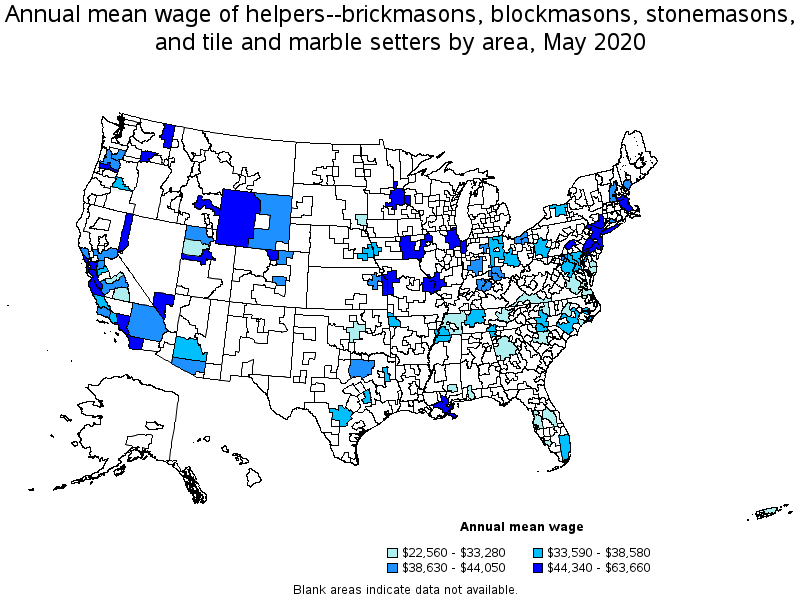 States and areas with the highest published employment, location quotients, and wages for Helpers--Brickmasons, Blockmasons, Stonemasons, and Tile and Marble Setters are provided. For a list of all areas with employment in Helpers--Brickmasons, Blockmasons, Stonemasons, and Tile and Marble Setters, see the Create Customized Tables function.