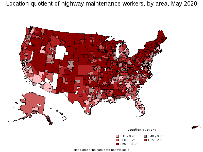States and areas with the highest published employment, location quotients, and wages for Highway Maintenance Workers are provided. For a list of all areas with employment in Highway Maintenance Workers, see the Create Customized Tables function.