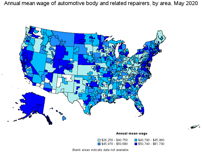States and areas with the highest published employment, location quotients, and wages for Automotive Body and Related Repairers are provided. For a list of all areas with employment in Automotive Body and Related Repairers, see the Create Customized Tables function.
