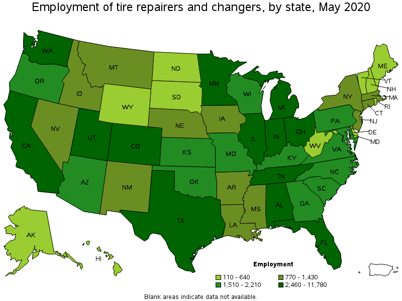 States and areas with the highest published employment, location quotients, and wages for Tire Repairers and Changers are provided. For a list of all areas with employment in Tire Repairers and Changers, see the Create Customized Tables function.