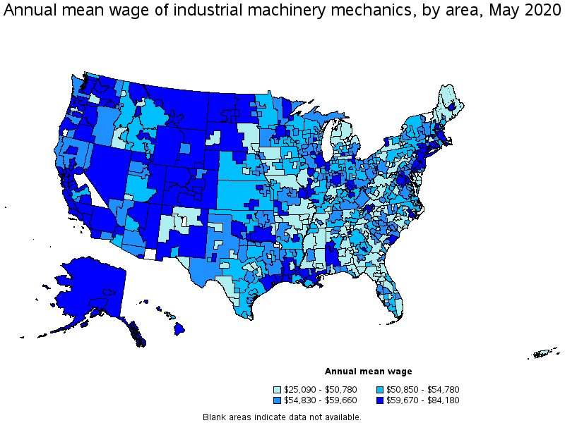 States and areas with the highest published employment, location quotients, and wages for Industrial Machinery Mechanics are provided. For a list of all areas with employment in Industrial Machinery Mechanics, see the Create Customized Tables function.