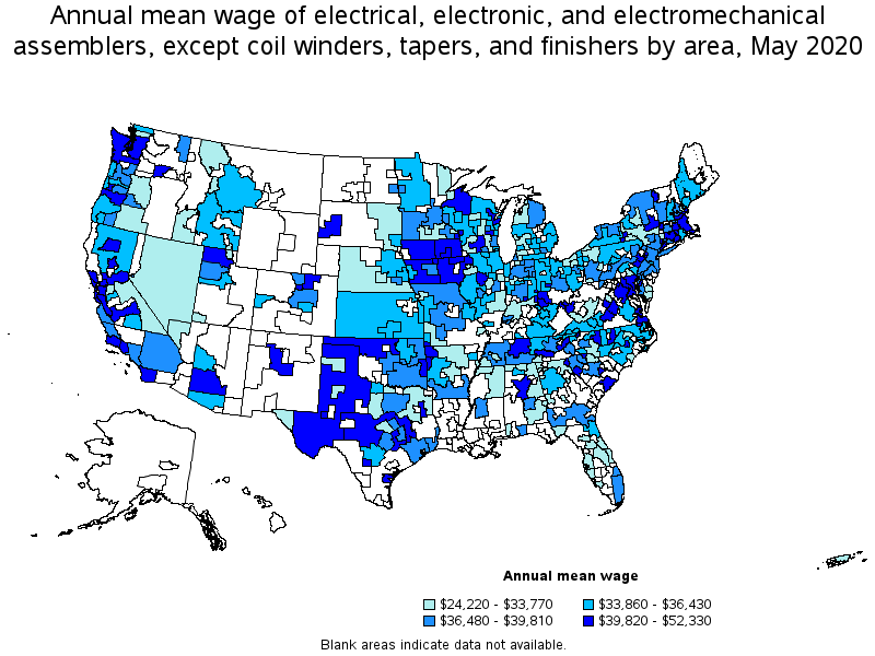 States and areas with the highest published employment, location quotients, and wages for Electrical, Electronic, and Electromechanical Assemblers, Except Coil Winders, Tapers, and Finishers are provided. For a list of all areas with employment in Electrical, Electronic, and Electromechanical Assemblers, Except Coil Winders, Tapers, and Finishers, see the Create Customized Tables function.
