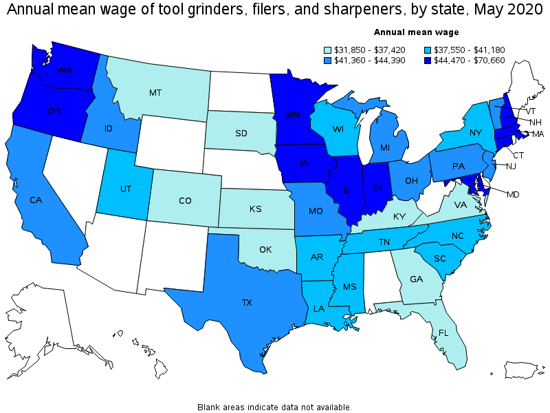 States and areas with the highest published employment, location quotients, and wages for Tool Grinders, Filers, and Sharpeners are provided. For a list of all areas with employment in Tool Grinders, Filers, and Sharpeners, see the Create Customized Tables function.