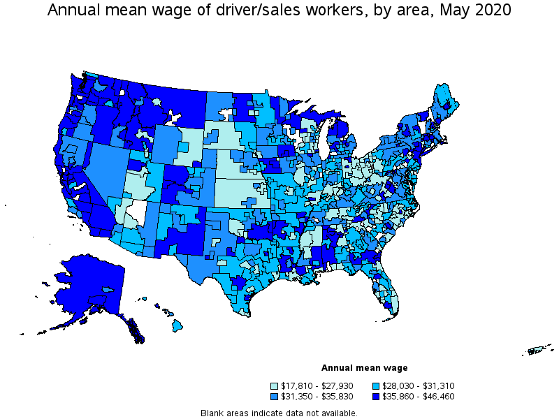 States and areas with the highest published employment, location quotients, and wages for Driver/Sales Workers are provided. For a list of all areas with employment in Driver/Sales Workers, see the Create Customized Tables function.