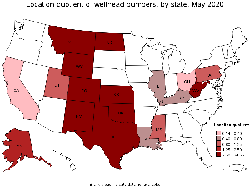States and areas with the highest published employment, location quotients, and wages for Wellhead Pumpers are provided. For a list of all areas with employment in Wellhead Pumpers, see the Create Customized Tables function.