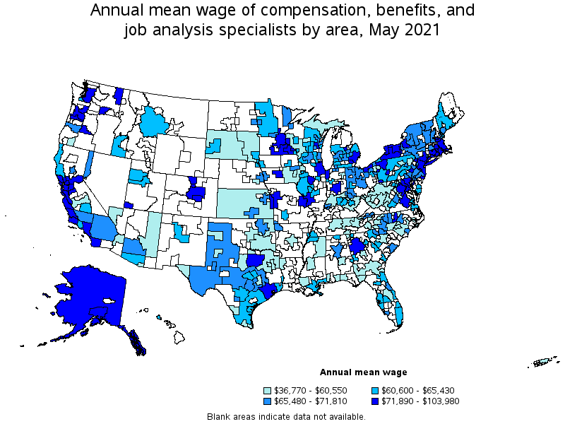 States and areas with the highest published employment, location quotients, and wages for Compensation, Benefits, and Job Analysis Specialists are provided. For a list of all areas with employment in Compensation, Benefits, and Job Analysis Specialists, see the Create Customized Tables function.