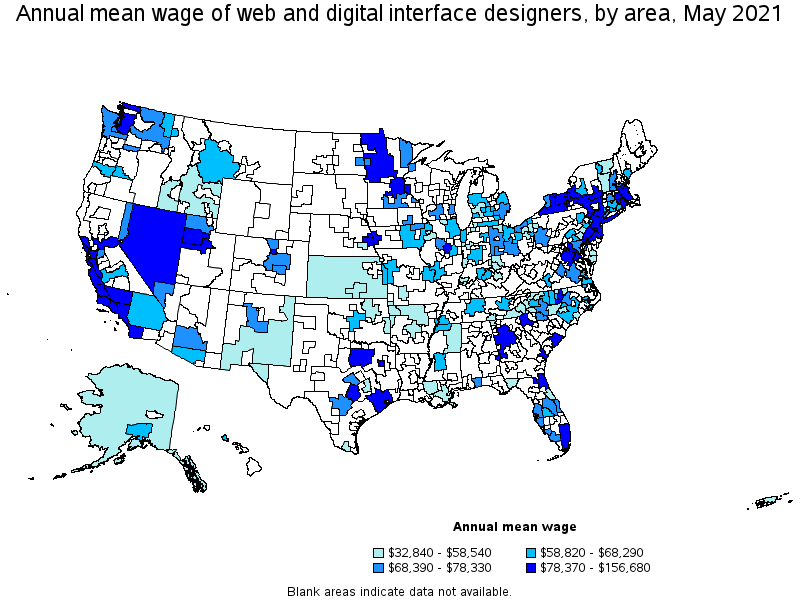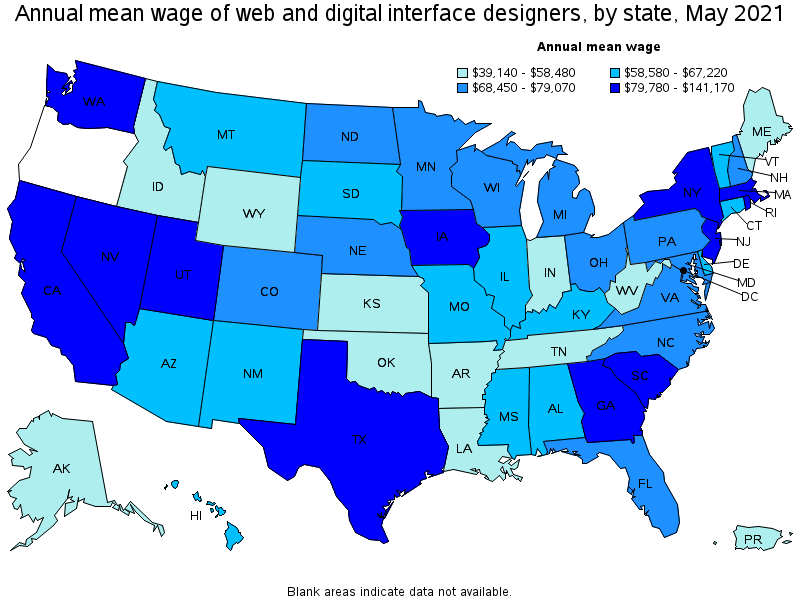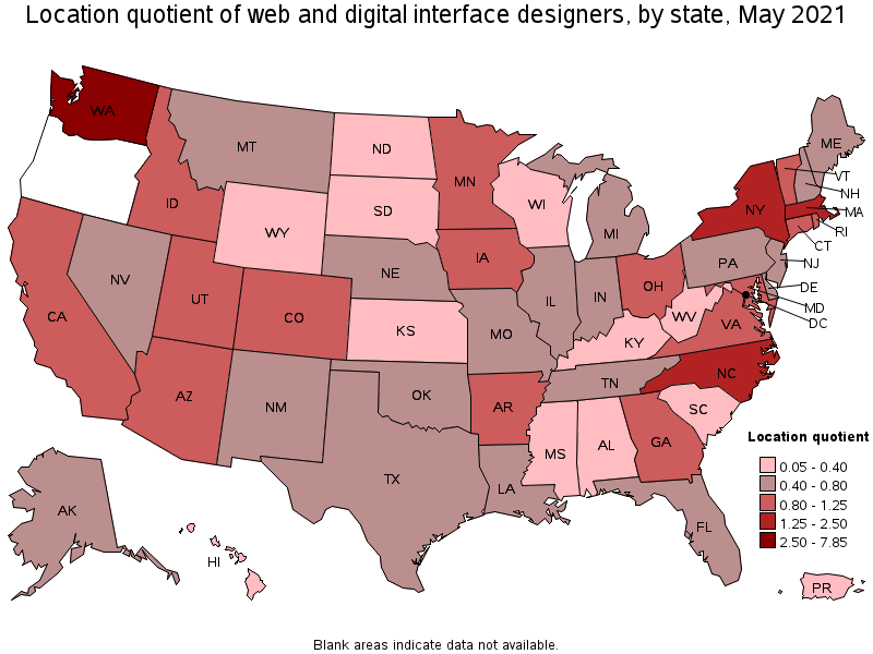 States and areas with the highest published employment, location quotients, and wages for Web and Digital Interface Designers are provided. For a list of all areas with employment in Web and Digital Interface Designers, see the Create Customized Tables function.