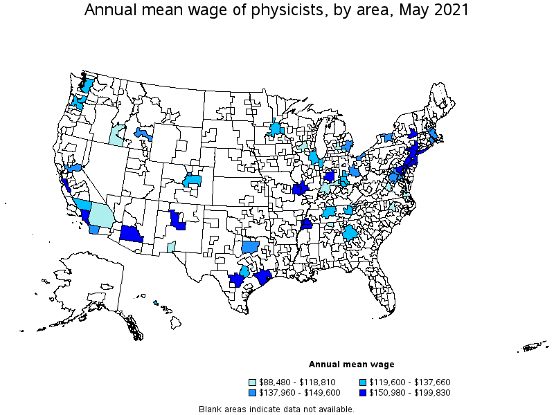 States and areas with the highest published employment, location quotients, and wages for Physicists are provided. For a list of all areas with employment in Physicists, see the Create Customized Tables function.