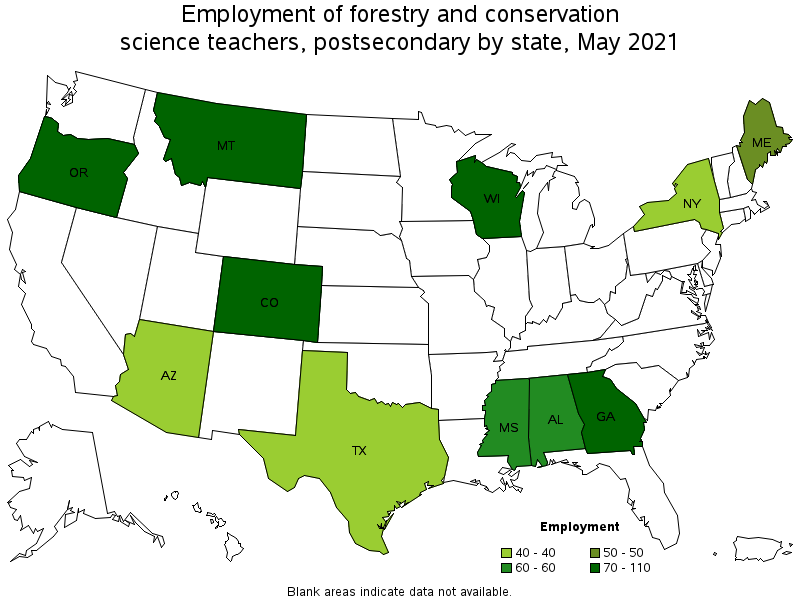 States and areas with the highest published employment, location quotients, and wages for Forestry and Conservation Science Teachers, Postsecondary are provided. For a list of all areas with employment in Forestry and Conservation Science Teachers, Postsecondary, see the Create Customized Tables function.