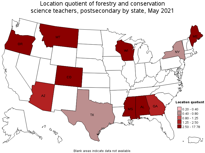 States with the highest concentration of jobs and location quotients in Forestry and Conservation Science Teachers, Postsecondary: