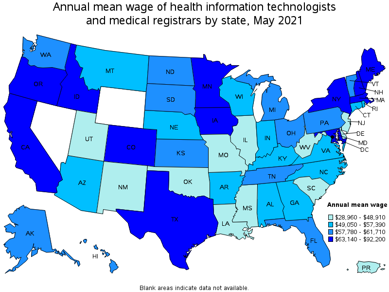 States and areas with the highest published employment, location quotients, and wages for Health Information Technologists and Medical Registrars are provided. For a list of all areas with employment in Health Information Technologists and Medical Registrars, see the Create Customized Tables function.