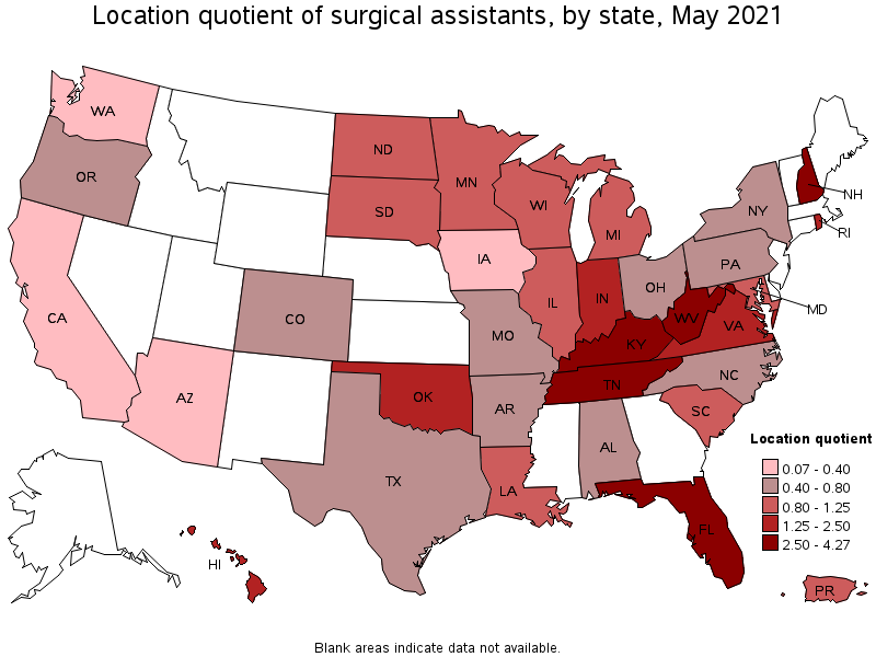 States with the highest concentration of jobs and location quotients in Surgical Assistants:
