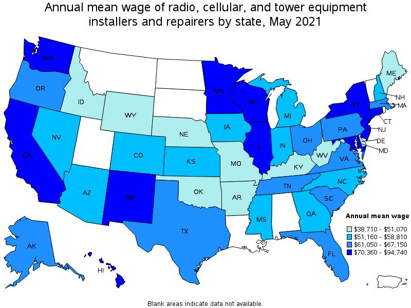 Top paying states for Radio, Cellular, and Tower Equipment Installers and Repairers:
