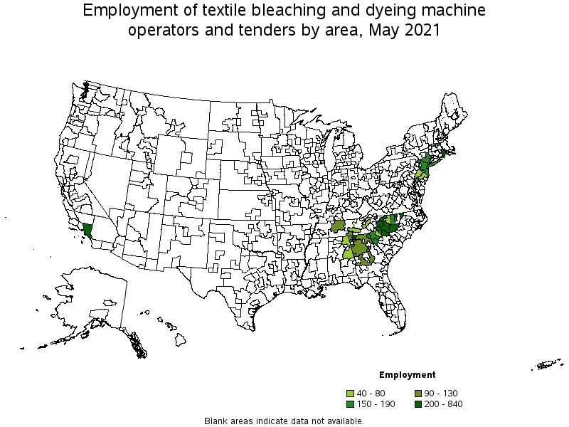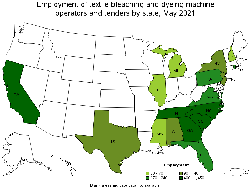 States and areas with the highest published employment, location quotients, and wages for Textile Bleaching and Dyeing Machine Operators and Tenders are provided. For a list of all areas with employment in Textile Bleaching and Dyeing Machine Operators and Tenders, see the Create Customized Tables function.