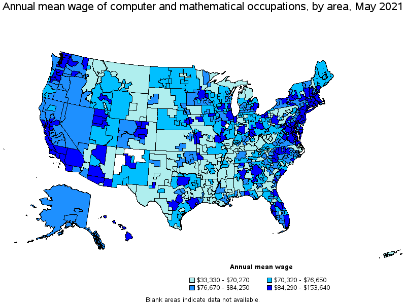 States and areas with the highest published employment, location quotients, and wages for Computer and Mathematical Occupations are provided. For a list of all areas with employment in Computer and Mathematical Occupations, see the Create Customized Tables function.