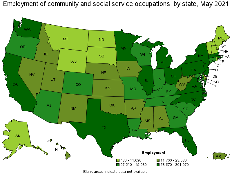 States and areas with the highest published employment, location quotients, and wages for Community and Social Service Occupations are provided. For a list of all areas with employment in Community and Social Service Occupations, see the Create Customized Tables function.