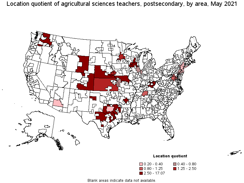 Metropolitan areas with the highest concentration of jobs and location quotients in Agricultural Sciences Teachers, Postsecondary: