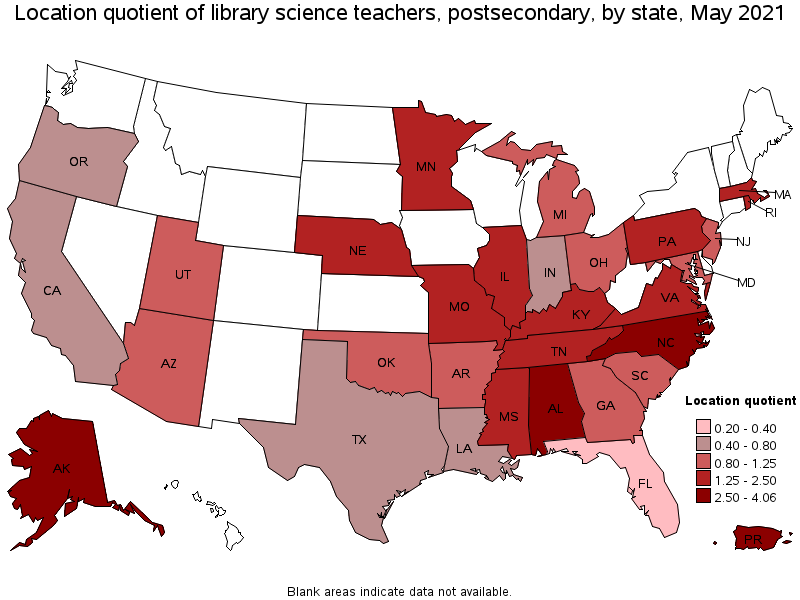 States with the highest concentration of jobs and location quotients in Library Science Teachers, Postsecondary: