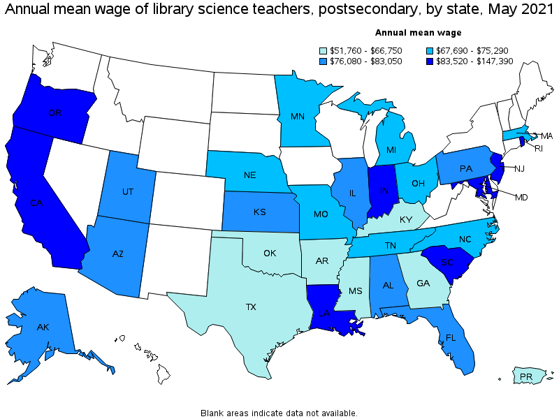 States and areas with the highest published employment, location quotients, and wages for Library Science Teachers, Postsecondary are provided. For a list of all areas with employment in Library Science Teachers, Postsecondary, see the Create Customized Tables function.