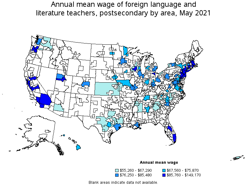 States and areas with the highest published employment, location quotients, and wages for Foreign Language and Literature Teachers, Postsecondary are provided. For a list of all areas with employment in Foreign Language and Literature Teachers, Postsecondary, see the Create Customized Tables function.