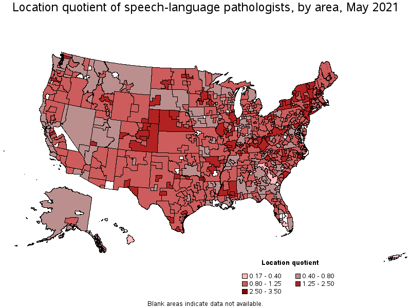 States and areas with the highest published employment, location quotients, and wages for Speech-Language Pathologists are provided. For a list of all areas with employment in Speech-Language Pathologists, see the Create Customized Tables function.